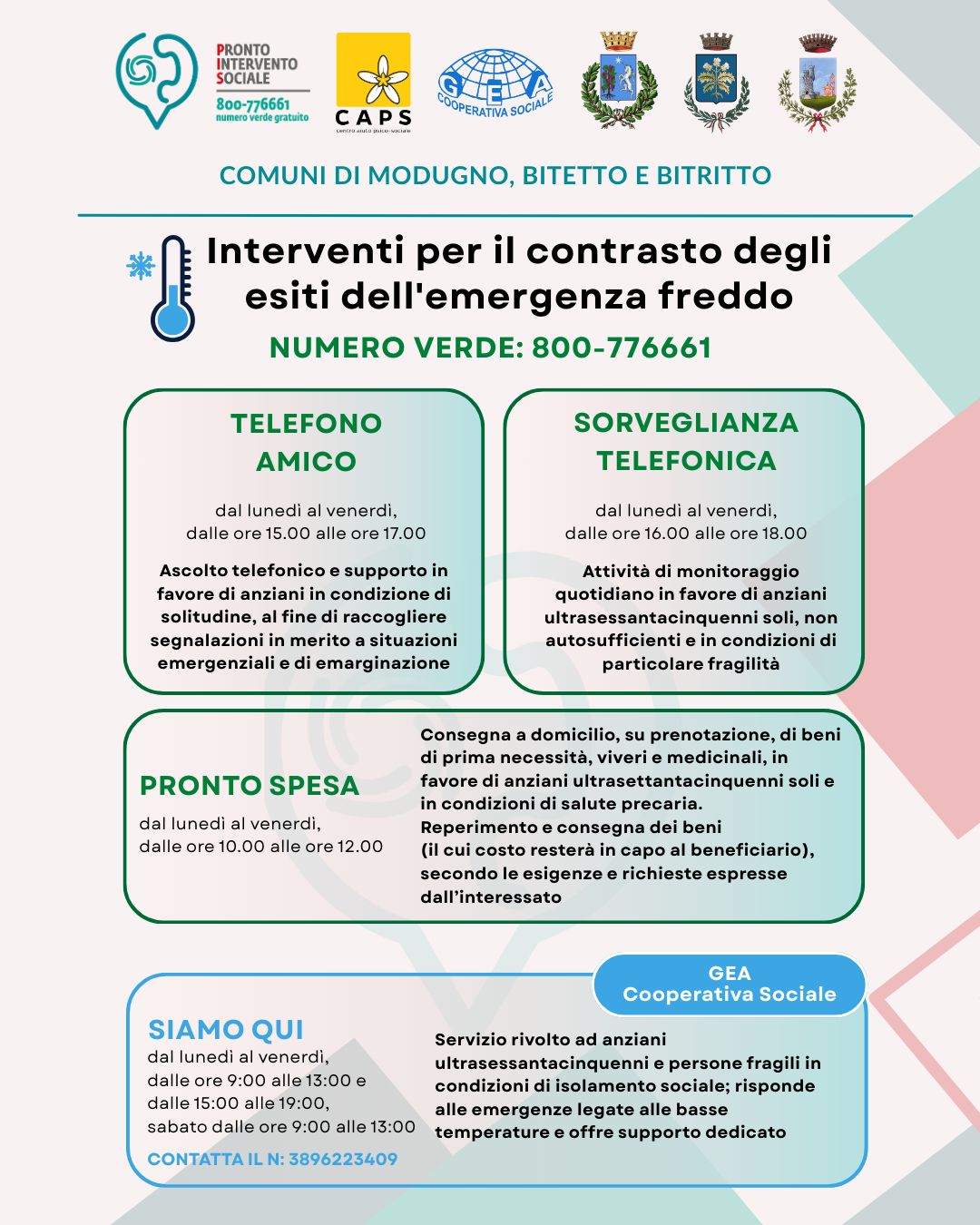 L'Ambito Sociale Ba10 (Modugno-Bitetto-Bitritto), ha attivato, attraverso il Pronto Intervento Sociale, in collaborazione con la cooperativa sociale CAPS, un piano coordinato di interventi per il contrasto agli effetti dell’emergenza freddo, rivolto in particolare agli anziani soli e alle persone fragili che vivono condizioni di isolamento sociale o di particolare vulnerabilità.